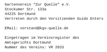Die bereitgestellten Informationen auf der Webseite www.gartenverein-zur-quelle.de, www.kgv-zur-quelle.de und www.kgv-quelle.de wurden sorgfältig geprüft und werden regelmäßig aktualisiert. Jedoch kann keine Haftung oder Garantie dafür übernommen werden, dass alle Angaben zu jeder Zeit vollständig, richtig und in letzter Aktualität dargestellt sind. Dies gilt insbesondere für alle „Links“ zu anderen Websites, auf die direkt oder indirekt verwiesen wird. Hinsichtlich der Links erklärt der Gartenverein Zur Quelle e.V. ausdrücklich, dass er keinerlei Einfluss auf die Gestaltung und die Inhalte der verlinkten Seiten hat und sich diese Inhalte nicht zu eigen macht.